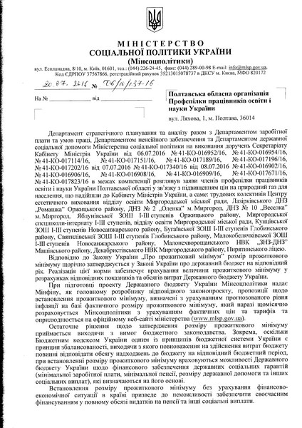 Відповідь Мінсоцполітики України на звернення обкому Профспілки та первинних організацій області.