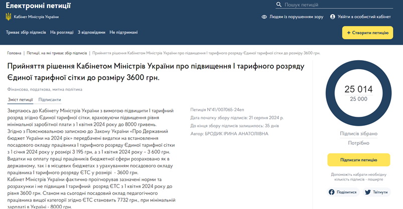 Електронна петиція щодо підвищення І тарифного розряду Єдиної тарифної сітки до 3600 грн набрала необхідну кількість голосів – 25 тисяч!